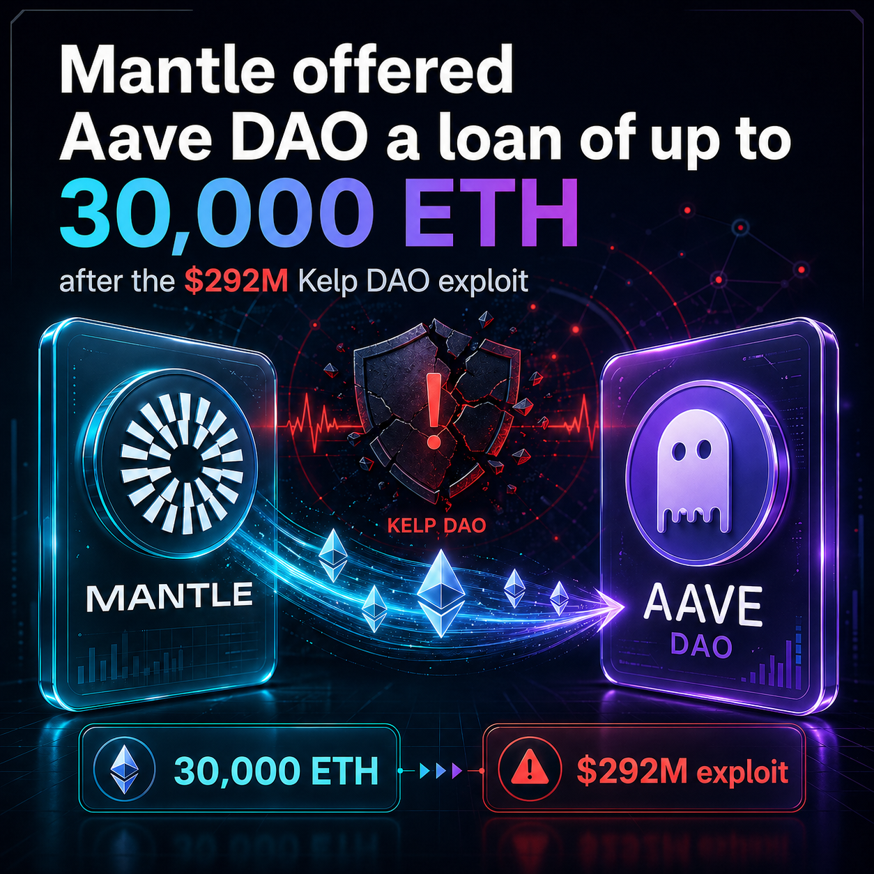 Mantle Network has proposed a loan of up to 30,000 ETH to Aave DAO to repay bad debt created after the $292 million Kelp DAO exploit. Proposal MIP-34 includes a credit line with a term of up to 36 months, an interest rate based on Lido’s staking yield plus 1%, and collateral through a multisig structure and Aave assets.